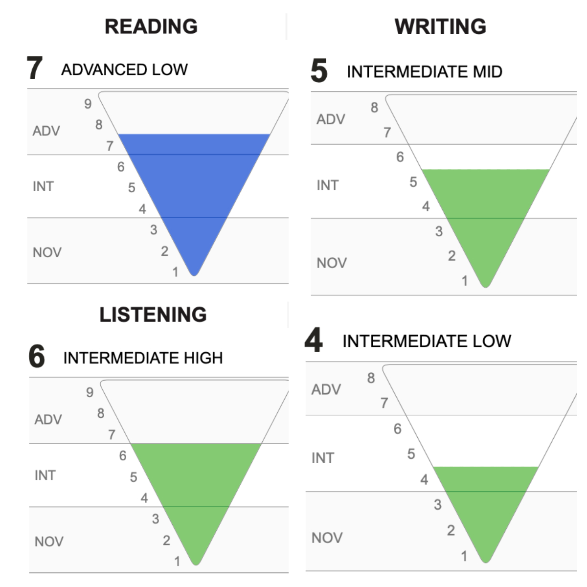 To my surprise, I did better than I had expected. In reading, my score was considered “advanced low.” In listening, I scored “intermediate high.” And in writing, I scored “intermediate mid” – this one definitely surprised me! I was not shocked to see a score of “intermediate low” in speaking – that is definitely one of the hardest areas for me. But it was rewarding to see these results and I’m glad I took the test.