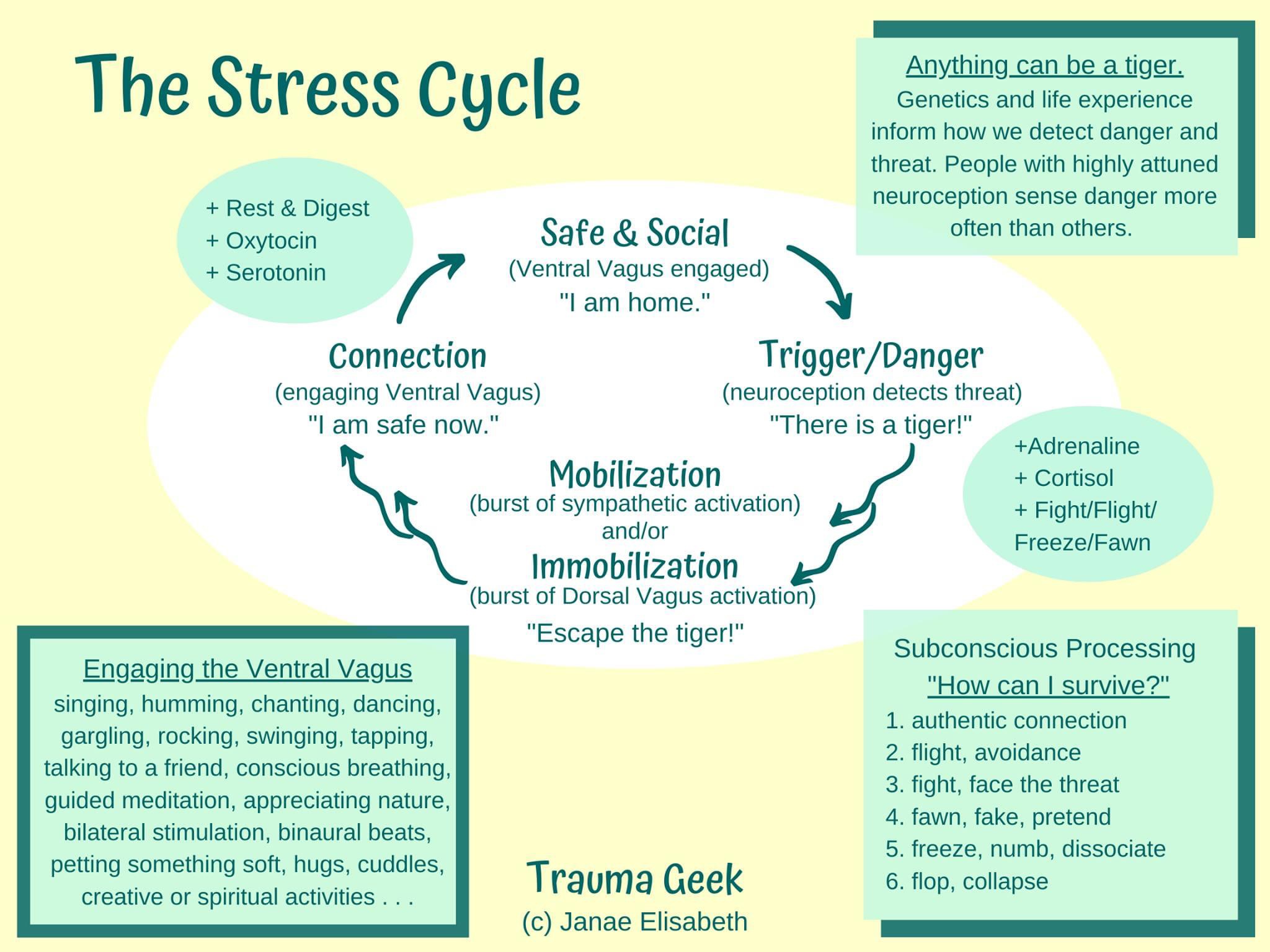 According to polyvagal theory, the vagus nerve in our nervous system helps to shape our stress, safety and social responses. Our nervous system is constantly scanning for cues of danger or safety, and often our body reacts before our thoughts can catch up to reassure us that there’s no tiger (or other danger) present.