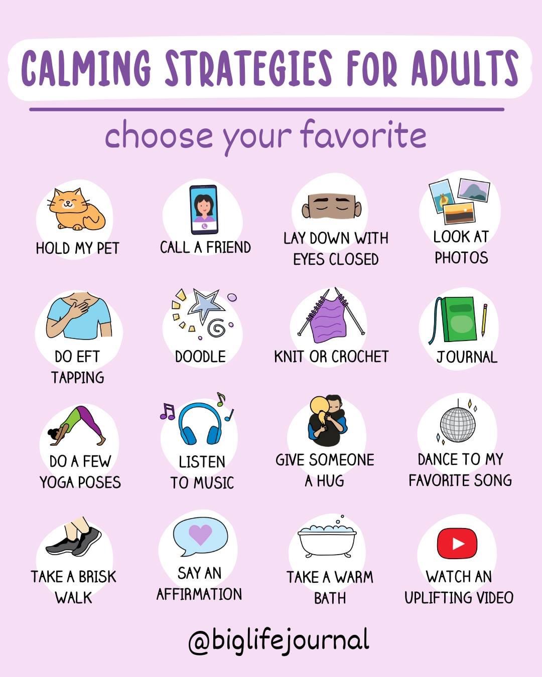 - Warmth: holding your hand over your heart, using a heating pad or having a warm drink can be very soothing and calming.